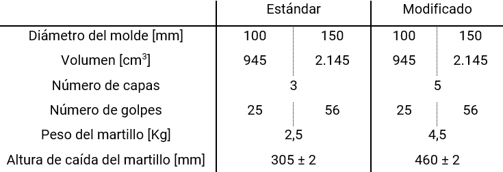 Básicamente ambos ensayos (Proctor Modificado y Normal) se rigen bajo la misma metodología, con las diferencias mostradas en la tabla anterior.