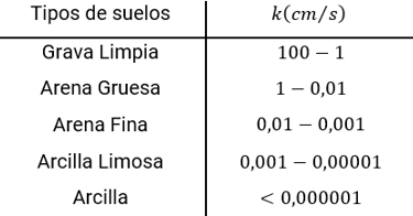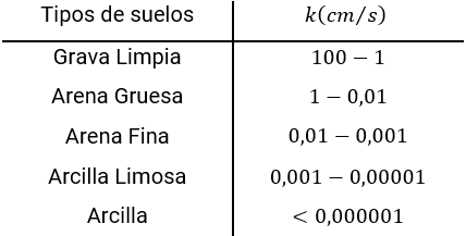 Además, existen valores tabulados para la estimación de las permeabilidades en los suelos, aunque siempre es recomendable realizar los ensayos pertinentes para determinarla.