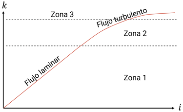 Zona 3: Flujo turbulento, generalmente sucede en los suelos gruesos donde las velocidades son significativamente altas, en este la relación entre el gradiente hidráulico y la velocidad deja de ser lineal.