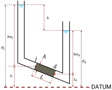 La longitud L para el gradiente hidráulico es la distancia paralela al flujo entre el punto “j” y “d” como se pudo observar en el esquema anterior. Por lo que el gradiente hidráulico es: