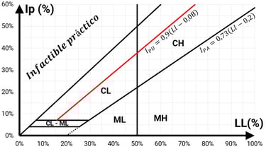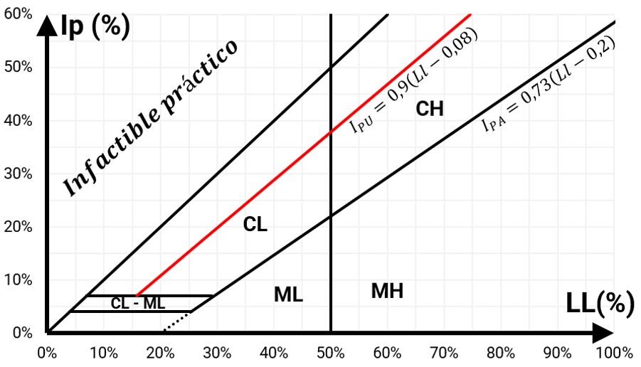La recta IPU es una frontera o límite superior del índice de plasticidad en conjunto al límite líquido, debido a que no se encuentran suelos con esta combinación, por lo que se consideran “Infactible Práctico”.