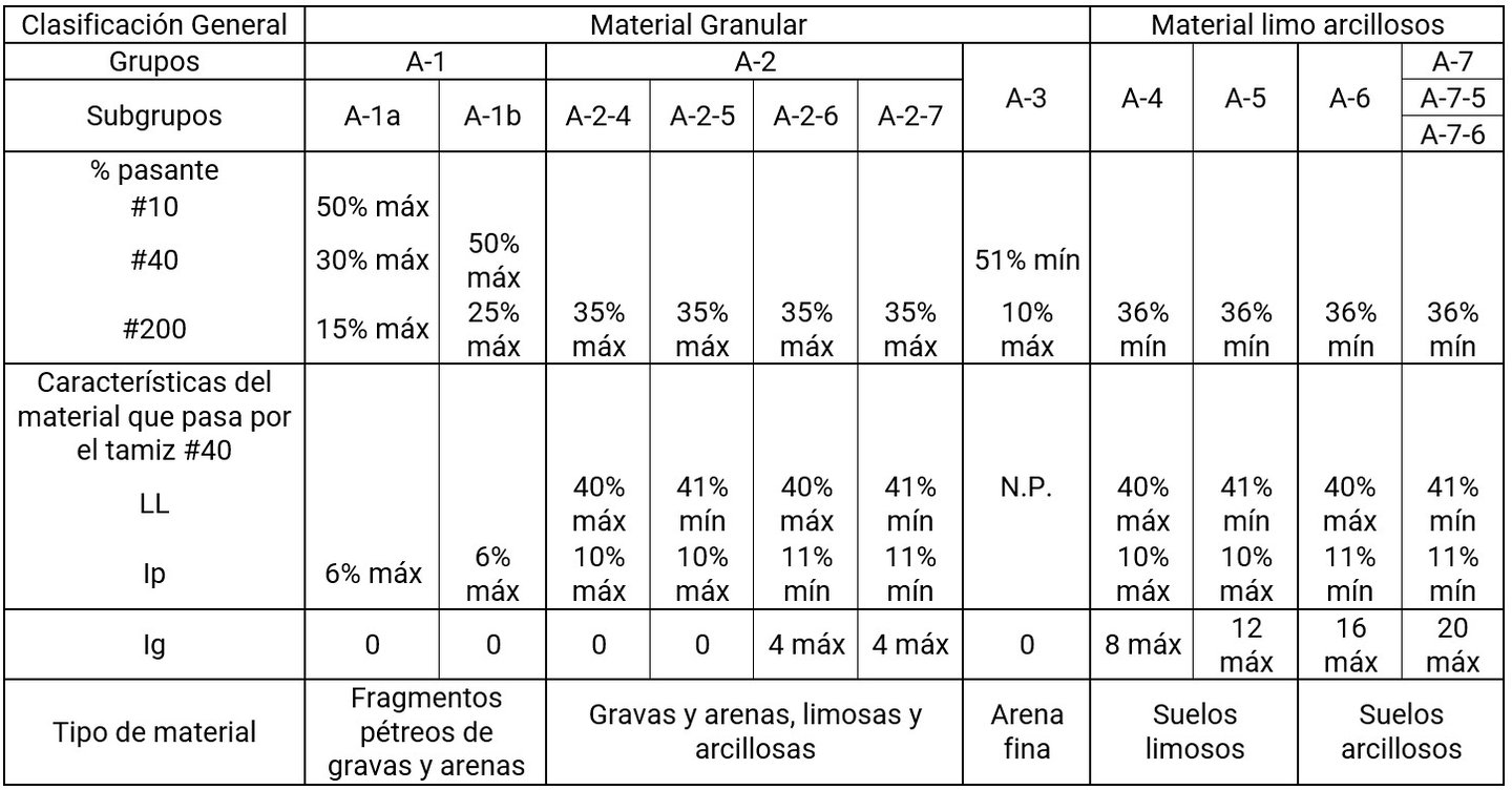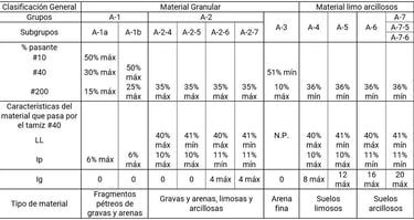 Material granular: Todo suelo que sea retenido en el tamiz #200. A-1, A-2 y A-3.