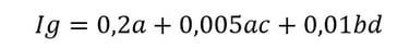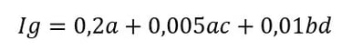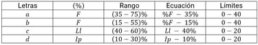 El cálculo del Ig se basa en el porcentaje de finos (a y b), límite líquido (c) e índice de plasticidad (d). Estos parámetros son calculados a través de las ecuaciones presentadas en la siguiente tabla, los cuales tienen un rango práctico de cálculo. Si los valores de los porcentajes son menores al rango, el valor a considerar será de cero (0); en cambio, si es superior al rango el valor a ingresar deberá ser el límite superior.