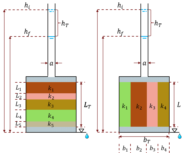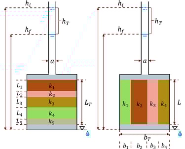Al momento de realizar un ensayo de permeabilidad, se puede estudiar el comportamiento de diferentes tipos de suelos. Y estos se pueden diferenciar en 2, según la configuración en la cual estos se encuentren depositados y la dirección del flujo, conocidos como: coeficiente de permeabilidad equivalente con configuración en serie y/o paralelo.